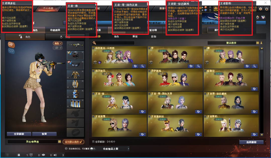 装备描述:排位:可以、、、、、、、、、、、爆破四防:幻神4皮肤+音效(白鲨、2022、电流骇客、黄忠皮肤)、M200-竞技荣光、98K星神、USP雷暴、柯尔特竞技荣光、G36幻影、白虎、QBZ金色蔷薇、王者蔷薇、、、幻神音效、朱雀音效、、、2套幻灵、5套竞技荣光、、、爆破四防(云悠悠、华、鹰、王者春、王者国色天香、王者惊若翩鸿、王者潘多拉、王者影豹)