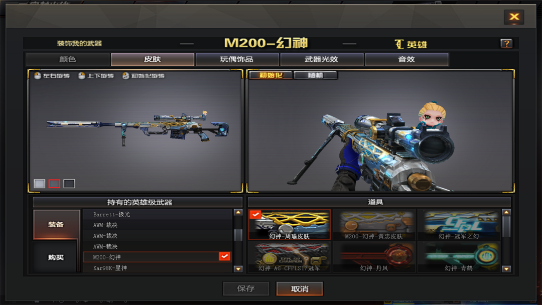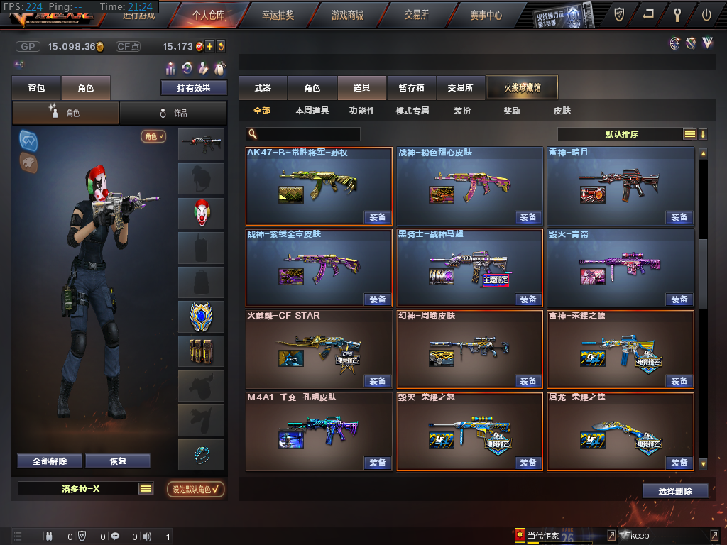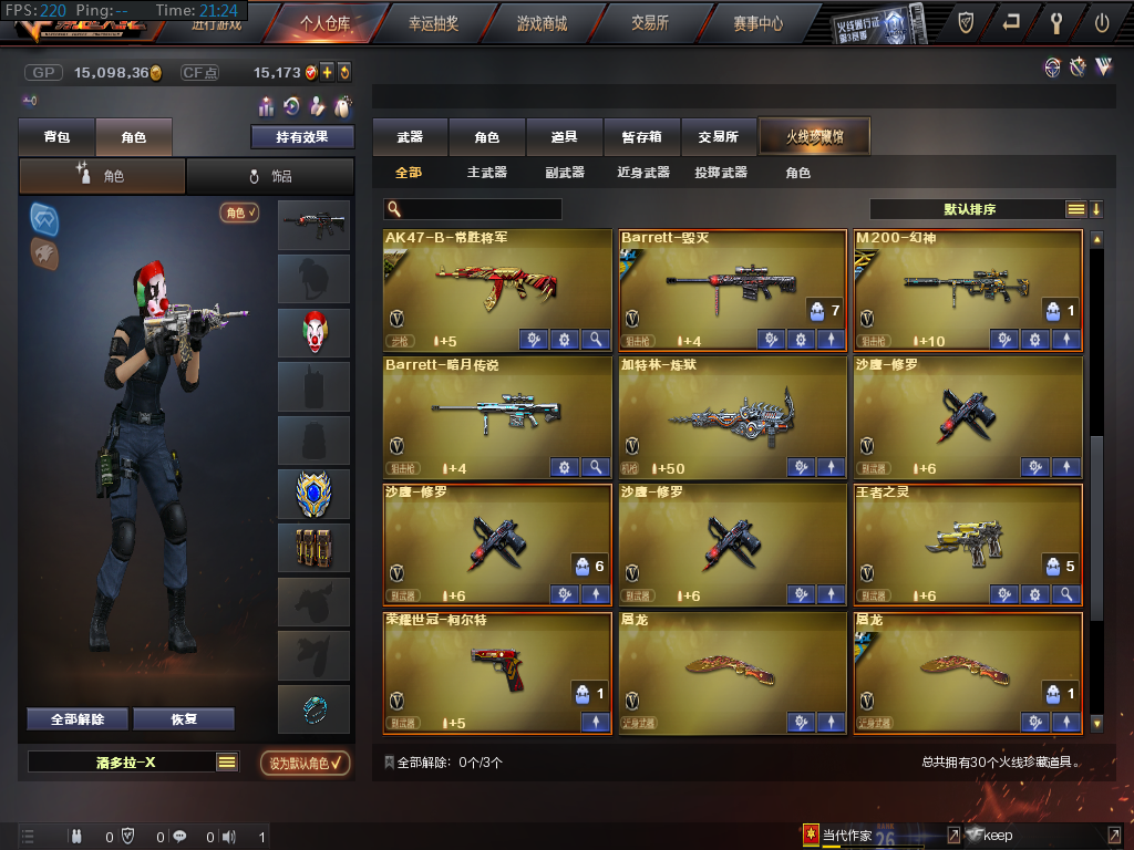 装备描述:王者武器:王者之锋-觉醒版;炫金火麒麟;王者之刺-觉醒版;QBZ-03-王者蔷薇;炫金千变;王者之灵-觉醒版 英雄武器:黑武士-锦绣游龙;无影-神兵利器;AK47-无影;马来剑-夜魔;烟雾弹-夜魔;高爆手雷-夜魔;闪光弹-夜魔;荣耀世冠-柯尔特;M4A1-玫瑰精灵;沙鹰-修罗;擎天;M4A1-死神;加特林-炼狱;屠龙;M200-幻神;Barrett-毁灭;AK47-B-战神;AK47-B-常胜将军;AK47-B-战士;M4A1-黑骑士;AK-47-猩红传说;Barrett-暗月传说;AK47-B-身先士卒;M4A1-雷神 角色:零;葵;复仇者;堕天使;救世主-X;蜀雪;樱-青春偶像;潘多拉-甜心教官;葵-芳心审判者;猎狐者-X 道具:烟雾保护头盔;绿色巨人;妖姬;夺命之镰;防化服;防弹头盔;C4工具钳;手雷包;防弹衣;Barrett-毁灭音效卡;炫彩背包;M200-幻神音效
