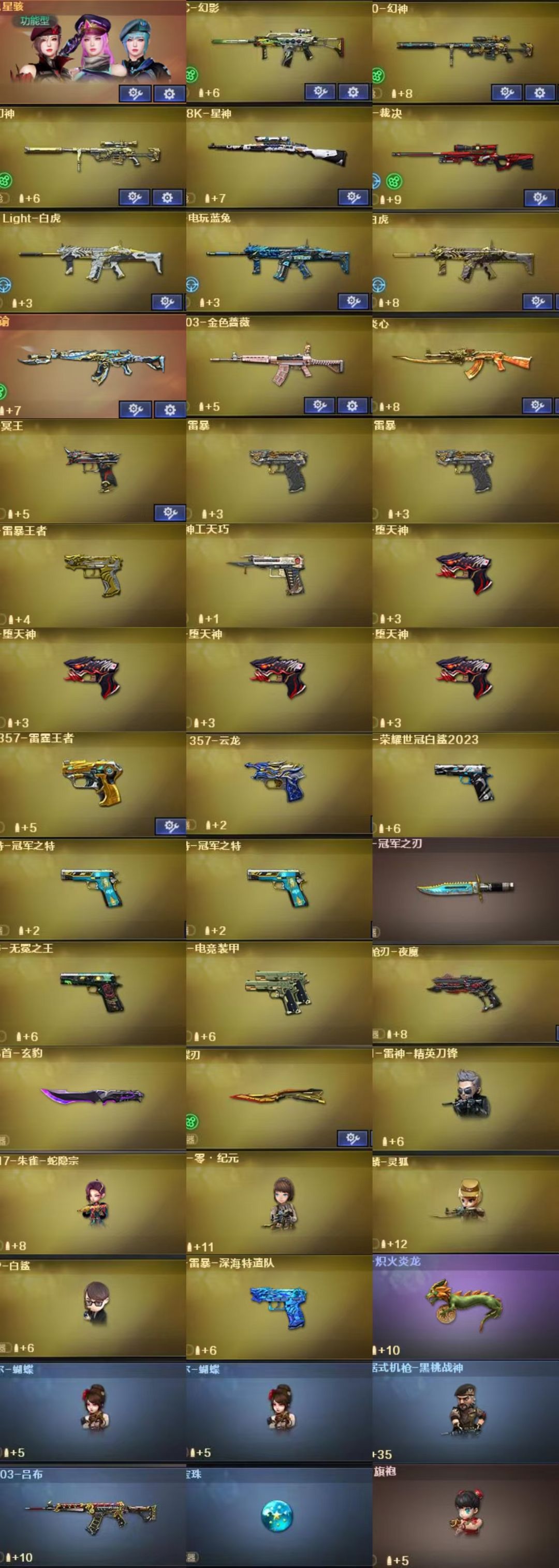 装备描述:269v 幻影传说星骇.圣谕❤幻神-欧欧.宠儿.冠军.丹凤.电流骇客.AG冠军.纸灯龙+音效❤星神-冠军之星+音效❤裁决-巅峰荣耀.运输船+音效❤金色蔷薇-冠军之薇.传奇宠儿.破浪逐光.2024+音效❤白虎-白鲨冠军.暗星+音效❤炽芒蝶刃-破浪逐光❤冠军之特*2.刃+USP-冥王.雷暴王者.雷暴*2.神工天巧+COP-堕天神*4.雷霆王者.云龙+柯尔特-白鲨2023.无冕之王.电竞装甲+破空枪刃-夜魔+丛林匕首-玄豹❤6烈龙+斯泰尔-蝴蝶*2+玄武❤王者幻神.白虎.炎心.冰峰.之势.魄.城.锋/白虎-电玩蓝兔/QBZ03-云龙/竞技荣光/极光/林匕首-玄豹/炽火炎龙/毁灭-2018.SV冠军.张飞.耀金.星空+音效/雷神-巅峰荣耀.荣耀.冠军.白鲨冠军.R.LGD冠军.耀金.星空.化蛇.再燃火线+音效/火麒麟-2018.华夏之心.AG.STAR.雷神.心动糖果.再燃火线+音效/黑骑士-冠军.白马银枪+音效/黑龙-冠军/极光-高能霹雳/ 千变-孔明/天龙-STAR.传奇/碧霄极光+音效/炼狱-百战金芒+音效/炼狱-迷彩/烈龙-星空/修罗-冠军.STAR.星空/屠龙-巅峰.荣耀/18音效