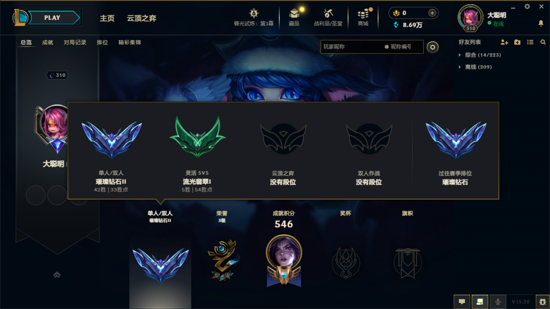 段位:310级 璀璨钻石II级 璀璨钻石II
