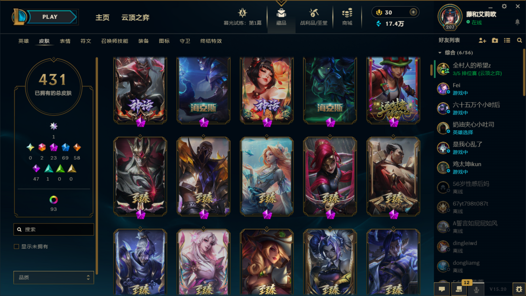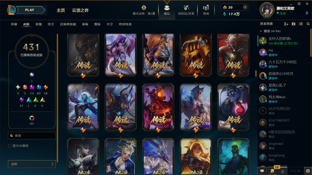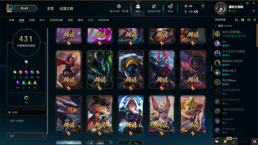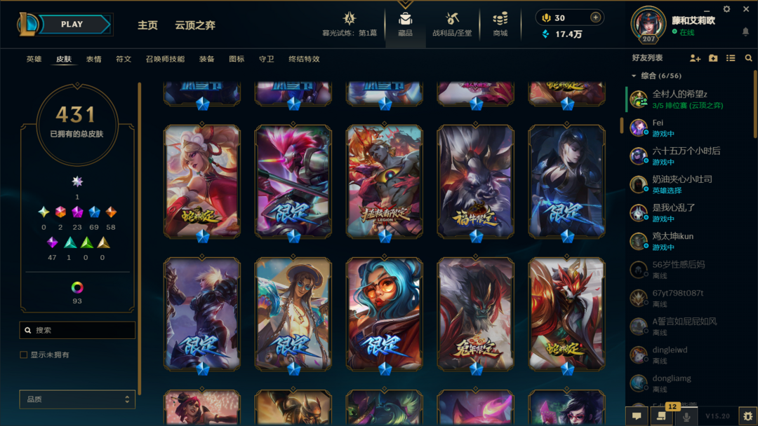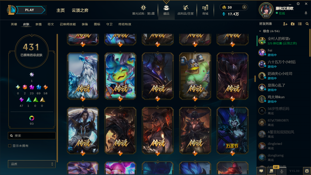 联盟五区德玛西亚431原皮肤,164炫彩,36臻彩,单双翡翠灵排白金云顶白金,可排位,多高质量皮肤