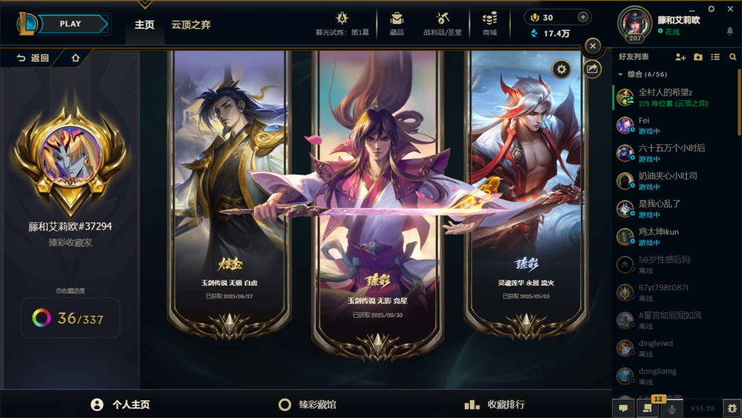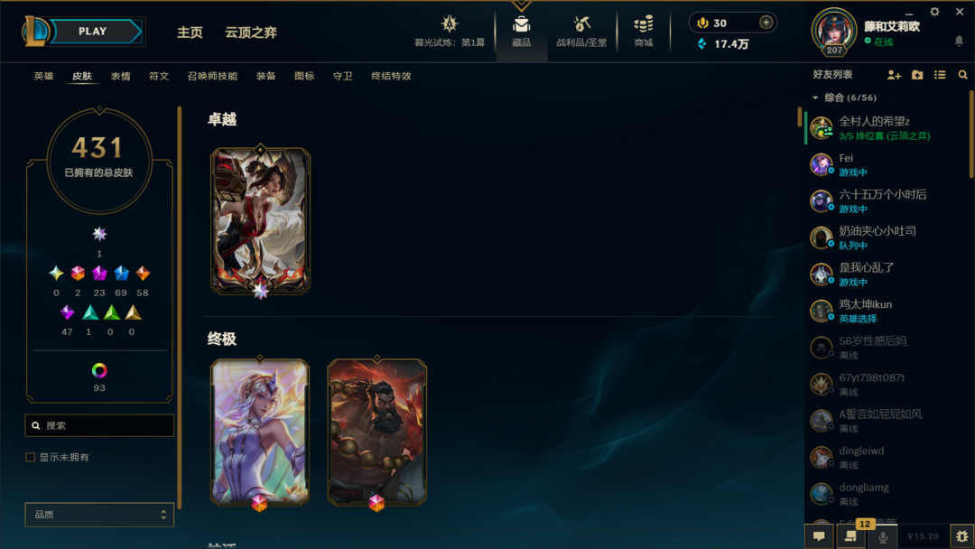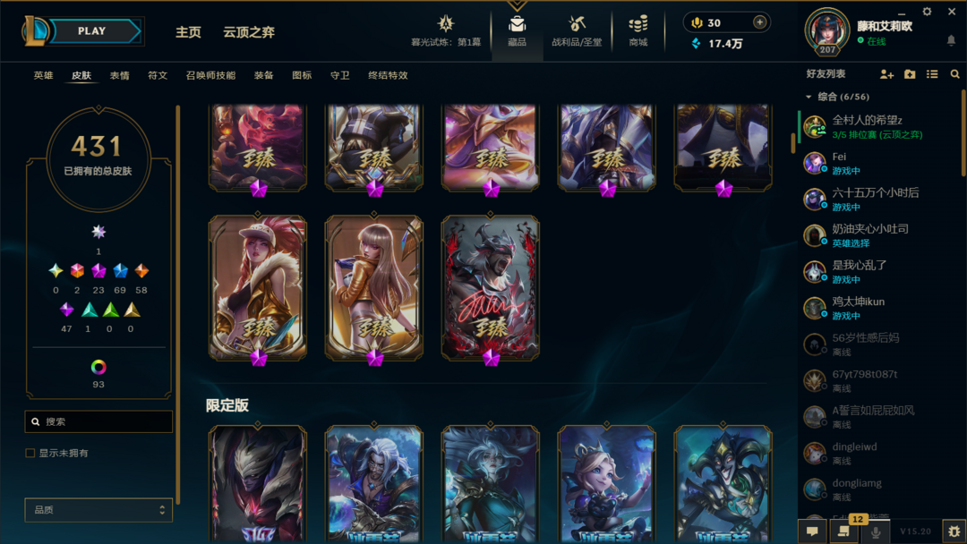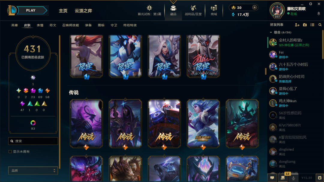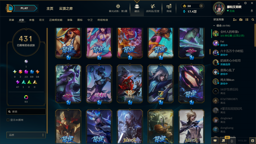 联盟五区德玛西亚431原皮肤,164炫彩,36臻彩,单双翡翠灵排白金云顶白金,可排位,多高质量皮肤