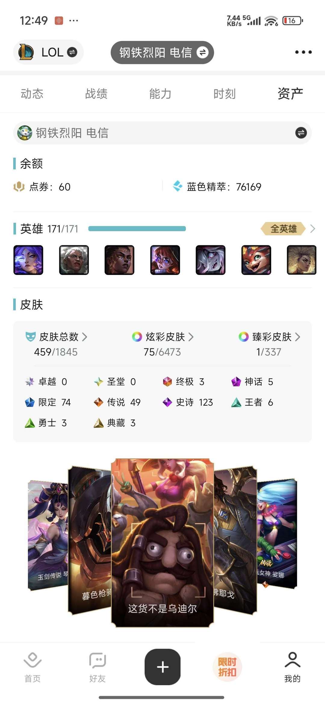 装备描述:459多个皮肤,排位可以打。。。。。。。。。。