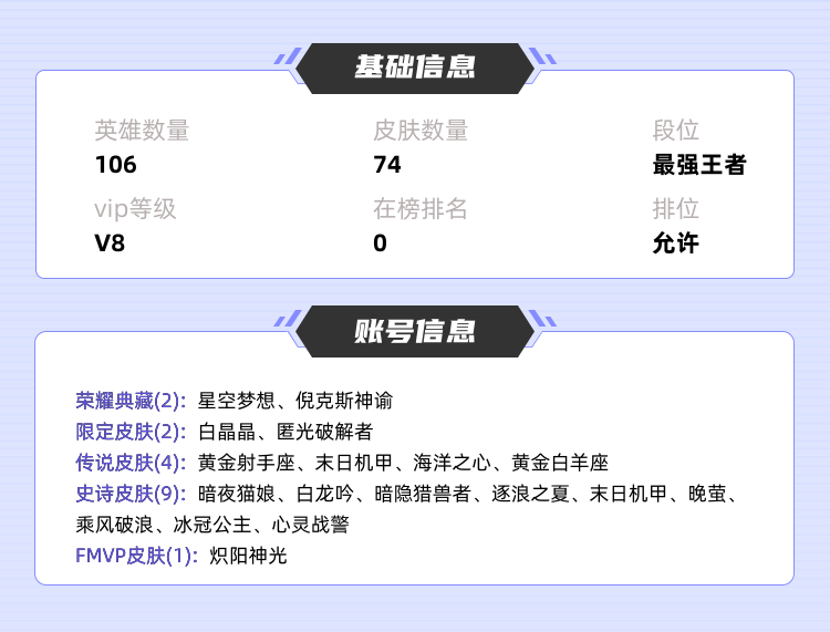 装备描述:满英雄300+皮肤铭文齐全 禁止挂机 言语辱骂 送人头 没那实力菜别打排位 否则拉黑扣押金贵族8低调装x首选