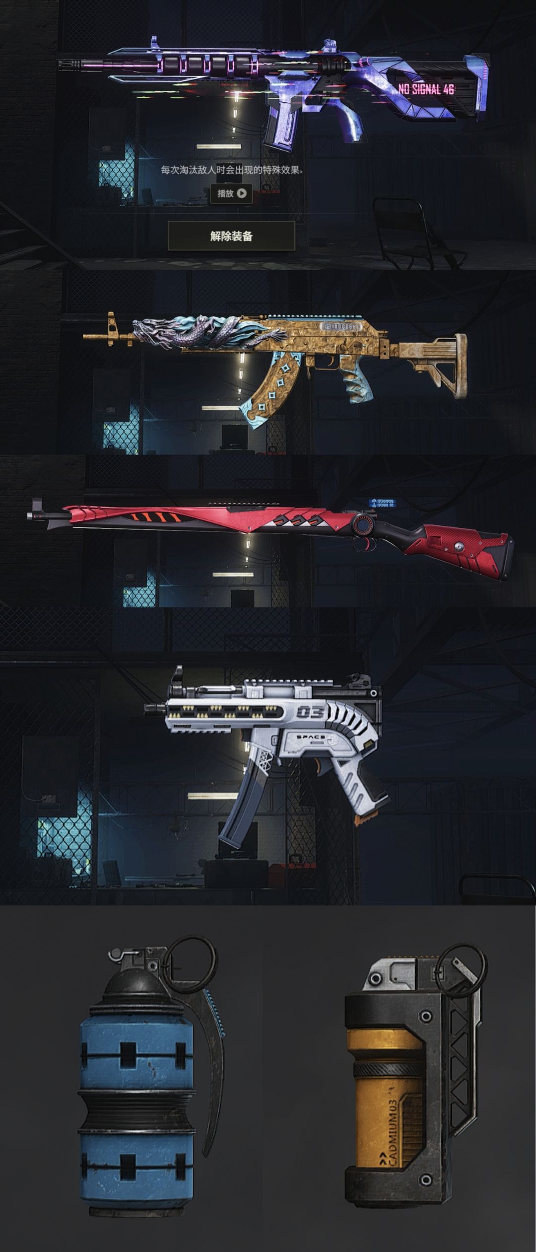 装备描述:布加迪跑车/全兰博/马丁跑车【九神器】满级异色无信号M416/三级异色青龙M762/午夜惊魂98K/无重力MP5K/时光加农SKS/橘、蓝色烟雾弹/悲喜套装/小战神套装/金面/发光手臂/白熊套装/